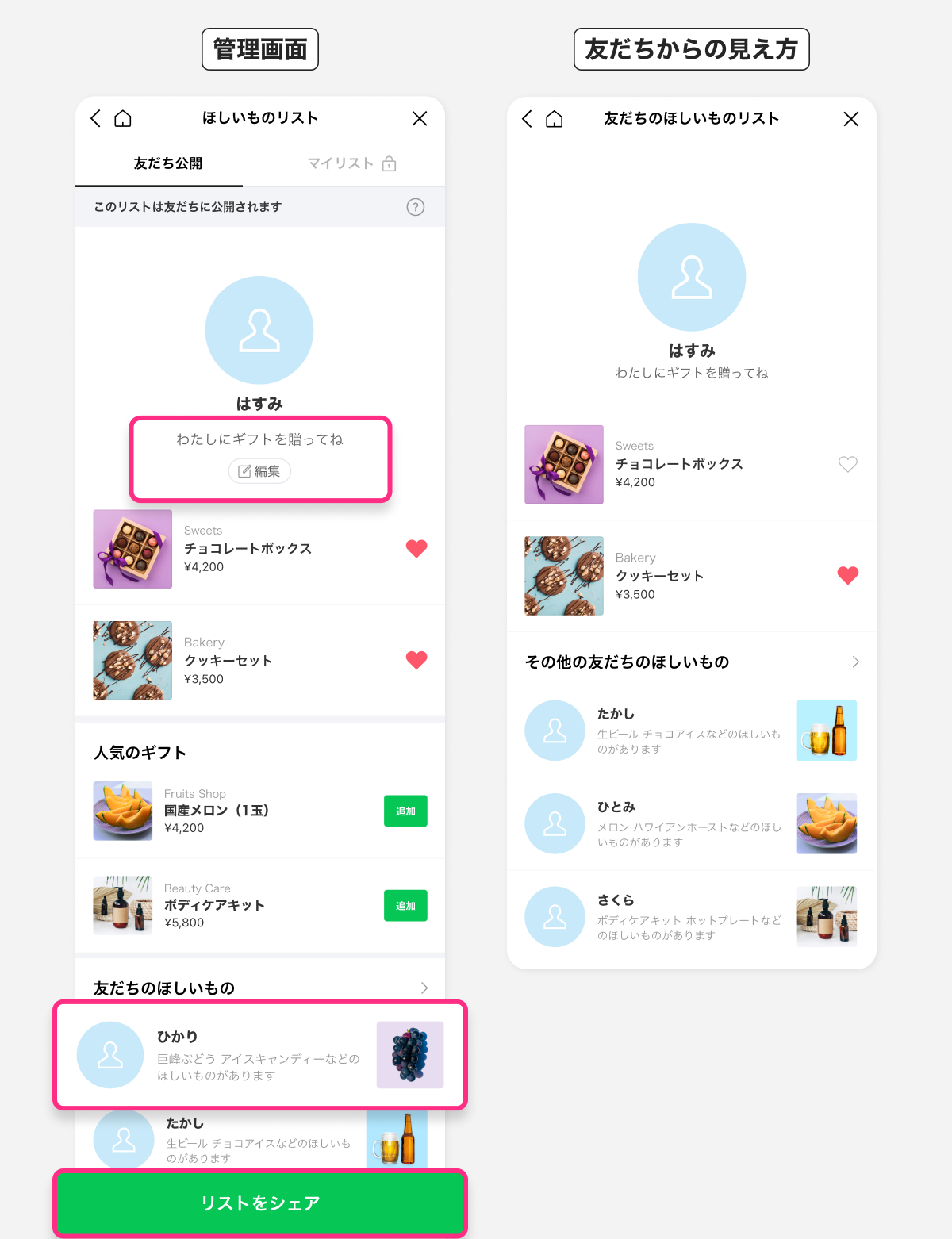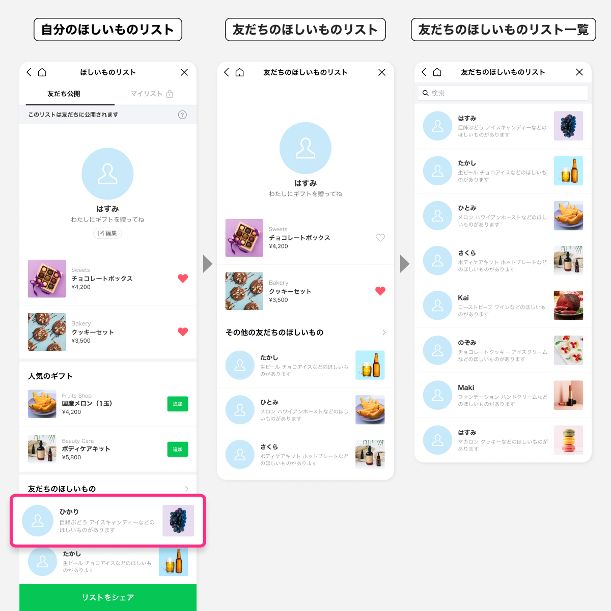 友だちがほしいものリスト(友だち公開)を自分宛にシェアすると、友だちのほしいものリスト(友だち公開)にアクセスすることができます。